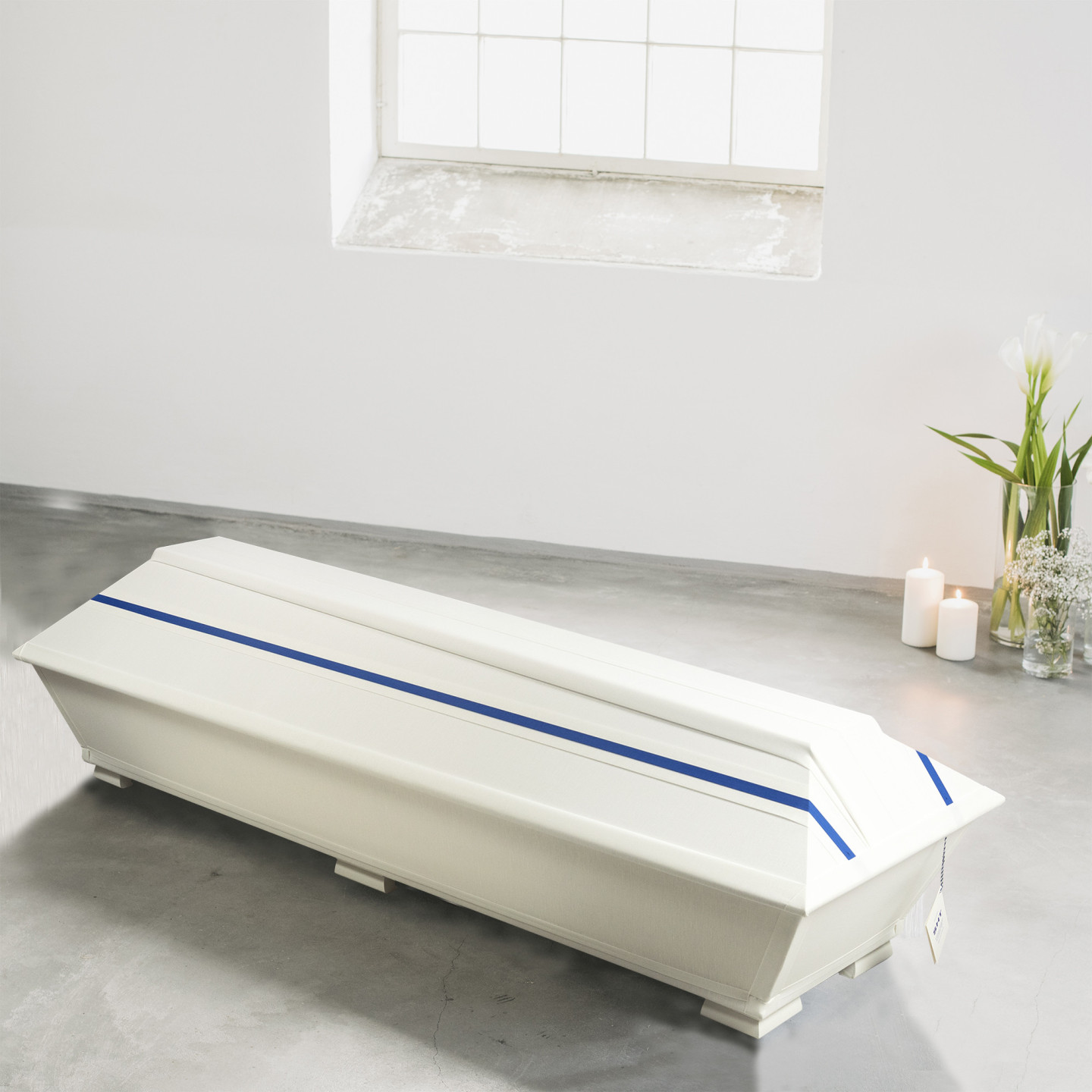 Hillityn tyylikäs arkku saattaa viimeiselle matkalle Suomen puhtaissa väreissä: merensineä vasten valkeaa. Siniset nauhat korostavat arkun linjakasta muotoilua. Pellavalla verhoiltu arkku on selkeä ja kaunis.