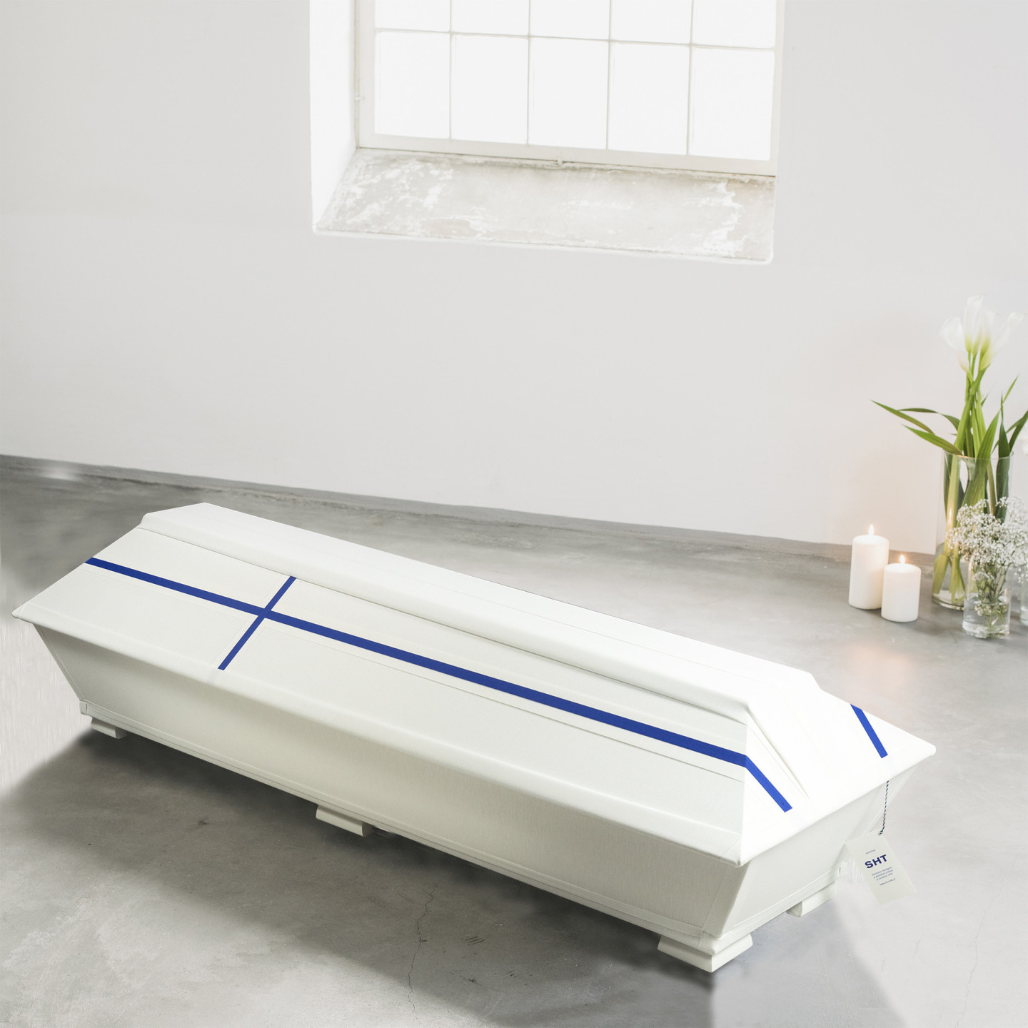 Suomen symboli sininen risti on tyylikkäästi mutta näkyvästi läsnä läheisen viimeisellä matkalla. Kannen sinivalkoinen ristikuvio viimeistelee valkealla pellavalla verhoillun arkun. Arkku on suomalaisen SHT-tukun mallistoa.