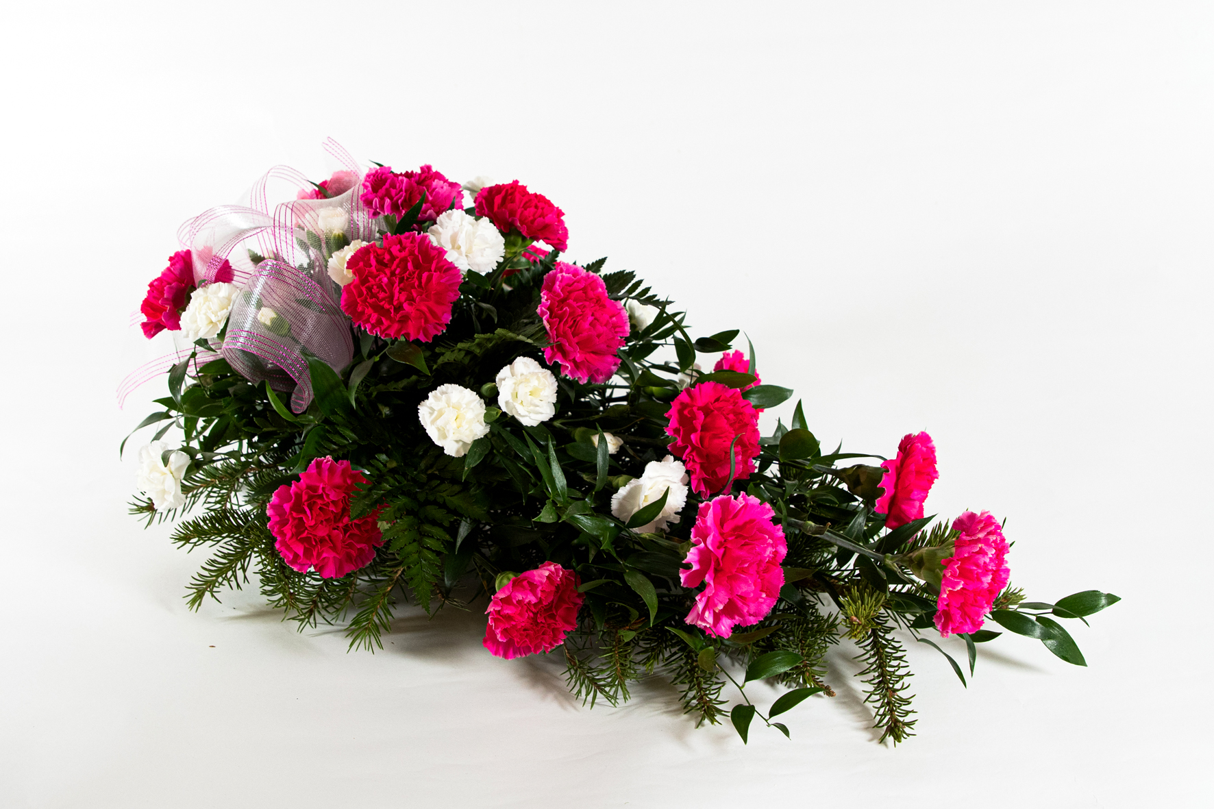 Surulaite, jossa kukkina neilikkaa ja eleganssineilikkaa. Surulaitteeseen voi valita myös muun väriset neilikat (esim. tummanpunainen, oranssi, valkoinen tai lila). Kuvassa olevan kukkalaitteen koko on ”Keskikoko”.